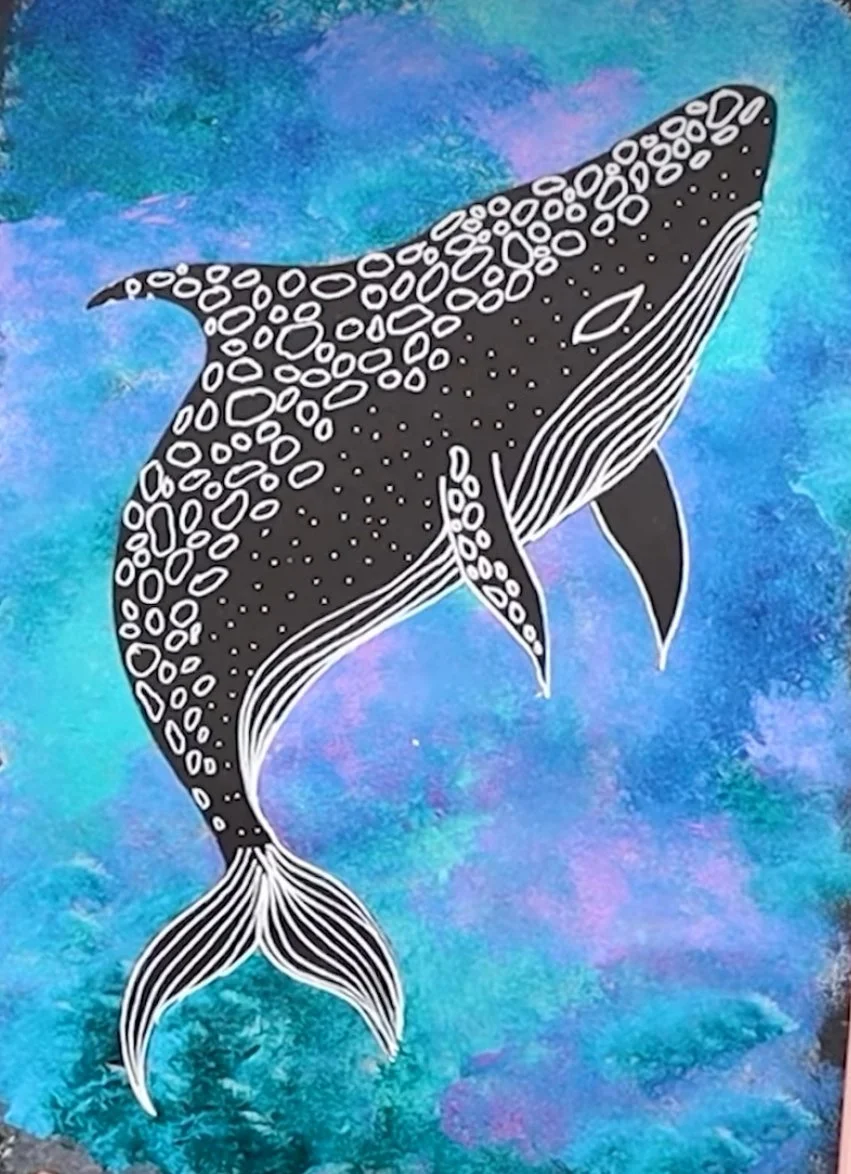 This lovely artwork is made on heavy hotpress paper with acrylic paints and Posca paint pens. We’ll take kids step by step through drawing and designing their very own dreamy whale, then have some serious fun using sponges to create a galaxy like background. Everyone is encouraged to unleash their creativity and add their own flair!